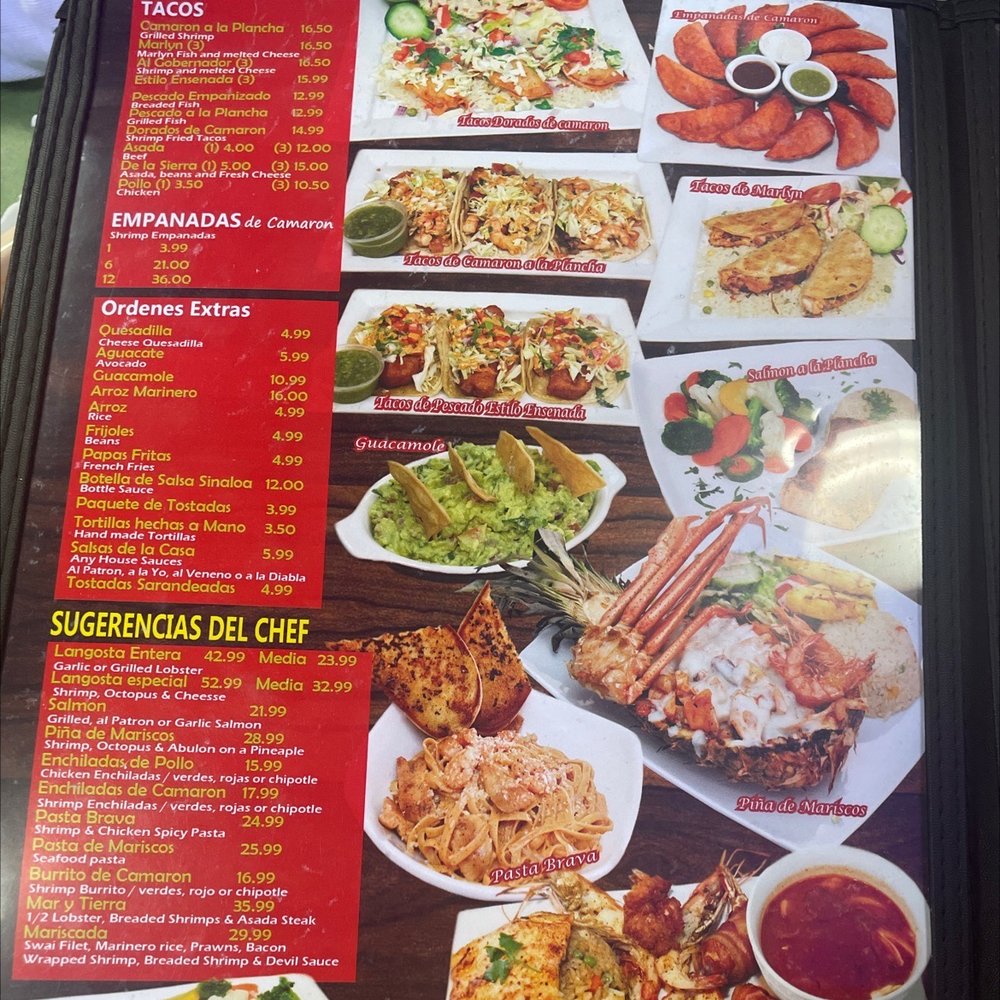 Culichi shrimp, garlic octopus, marinero rice, shrimp rancheros, grilled prawn, marlyn tacos, gobernador tacos and breaded shrimp.
